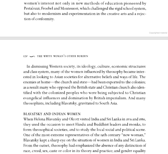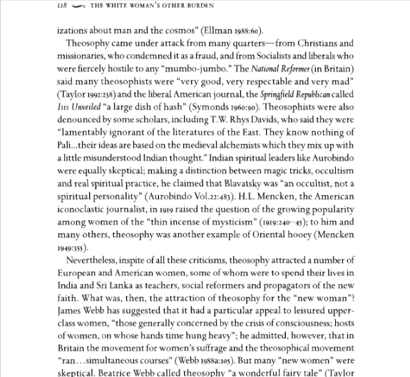From the outset, Kumari Jayawardena’s “The White Woman’s Other Burden” (1995) demonstrates, theosophy emphasized the absence of any distinction of race, creed, sex, caste or color in its theory and practice; and gender equality was therefore, one of its distinctive features. The 1995 work of Jayawardena details the roles and activities of foreign women in the context of colonial India. It mentions Blavatsky’s roles, and the perceptions about Theosophy from women and liberals, and the role of the upper-classes, colonialists, women socialists, and liberals.