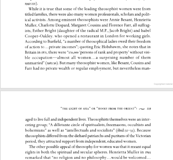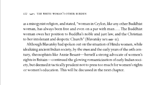 Here we witness the example of a man who was known as a harsh critic of his time anyway, not aware of the role of theosophists, nor Blavatsky’s in South Asia. It is undeniable theosophists attracted support from independent, educated women, who saw in theosophy, the appeal for what it meant toward equal rights in the secular and spiritual spheres, Kumari Jayawardena notes (1995: 119). These were the early women movers for ‘liberation’; thereby, fighting for what they saw as a place among “thinking and advanced minds.” It is careful to note here therefore, of the reality of the issues then.