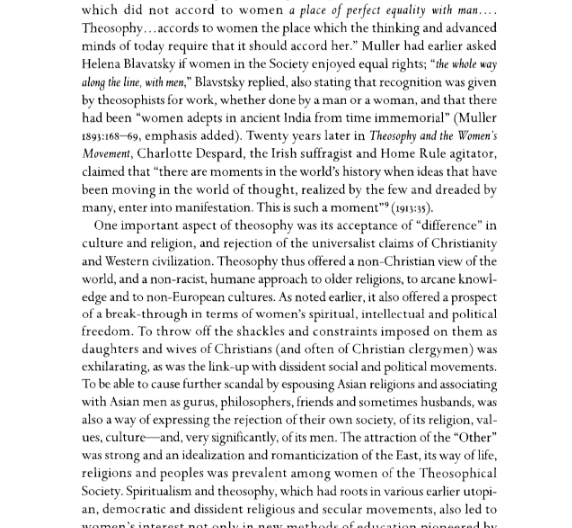 Kumari Jayawardena argues, that Blavatsky’s achievement was to make the theosophical movement not merely an occult society, but apart of the “progressive” thought of the late 19th century. Theosophy is not purely a product of the late 19th century, but the movement giving it expression has its social and political contexts.