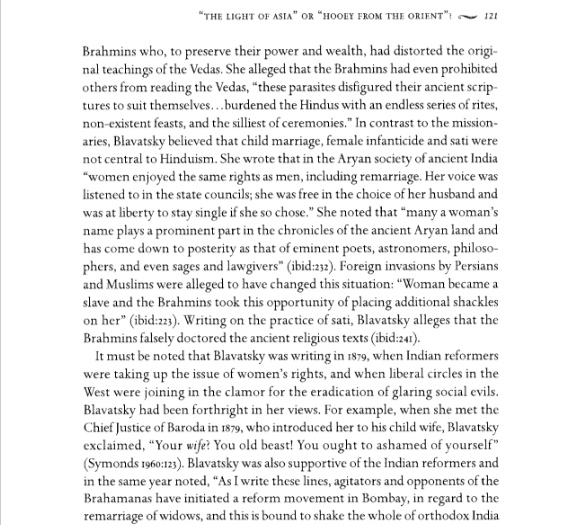 Blavatsky referred to female infanticide as a “terrible custom.” Further on, she condemns India’s marriage institutions and customs, but different from the same condemnations made by the missionaries who blamed it on Hinduism, she traced it to corruptions of Hinduism perpetrated by the Brahmins. She advocated that, child marriage, female infanticide and sati (an Indian widow practice) were not central to Hinduism, condemning the Brahmins for even prohibiting others from reading the Vedas, and doctoring certain ideas.