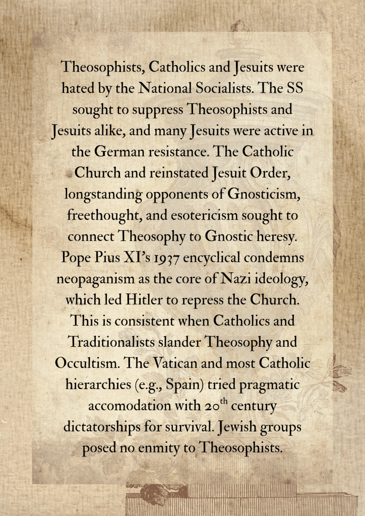 - Theosophists, Catholics and Jesuits were hated by the National Socialists. The SS sought to suppress Theosophists and Jesuits alike, and many Jesuits were active in the German resistance. The Catholic Church and reinstated Jesuit Order, longstanding opponents of Gnosticism, freethought, and esotericism sought to connect Theosophy to Gnostic heresy. Pope Pius XI’s 1937 encyclical condemns neopaganism as the core of Nazi ideology, which led Hitler to repress the Church. this is consistent when Catholics and Traditionalists slander Theosophy and Occultism. The Vatican and most Catholic hierarchies (e.g., Spain) tried pragmatic accomodation with 20th century dictatorships for survival. Jewish groups posed no enmity to Theosophists.